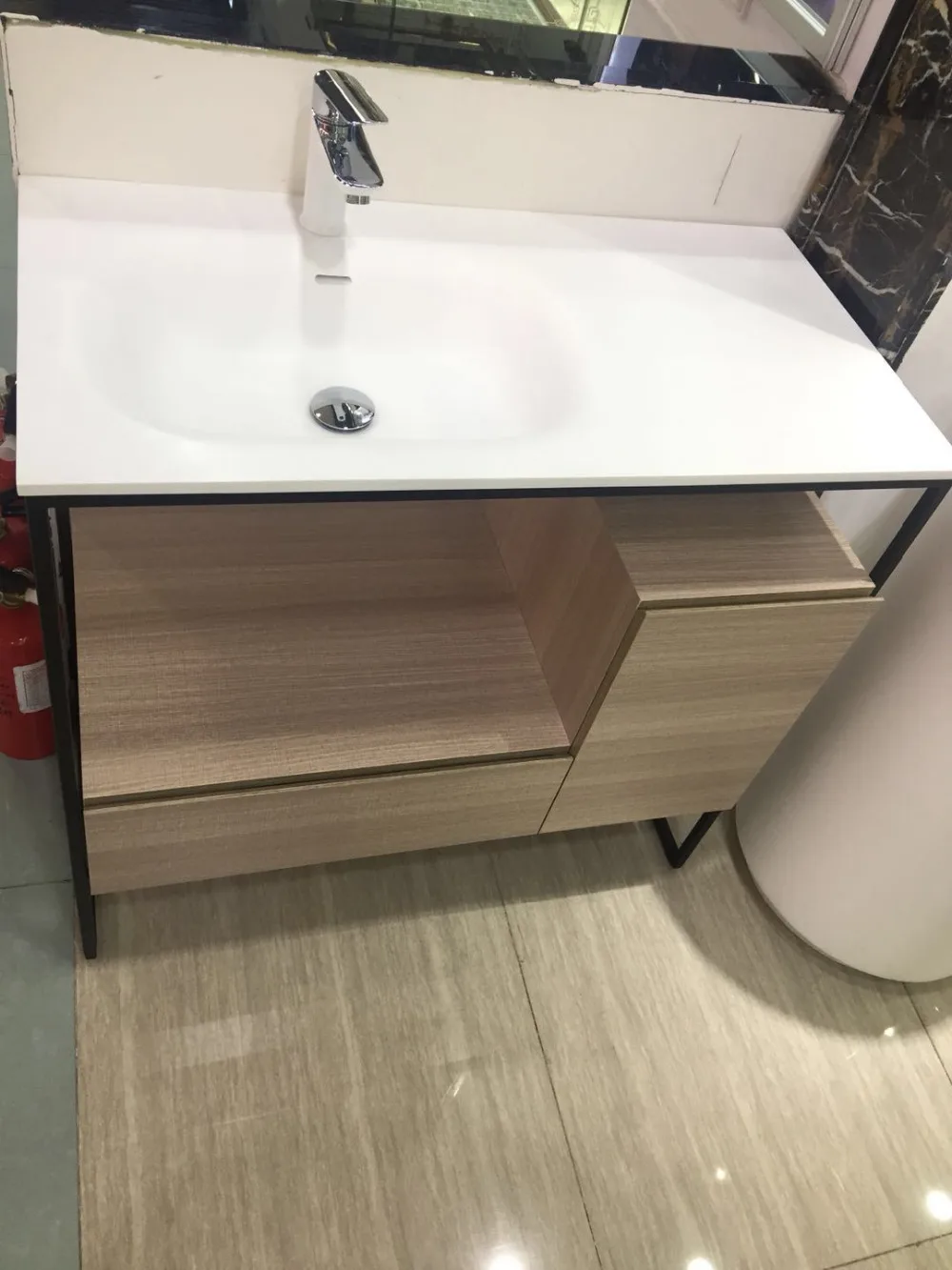 وانت porأرغب في شراء Bathroom Vanities, después 900 مللي متر الطابق شنت سطح صلب أكريليك الغرور البلوط خزانة حمام مرحاض مات الأبيض بالوعة 20000-0 tal vez crear interest