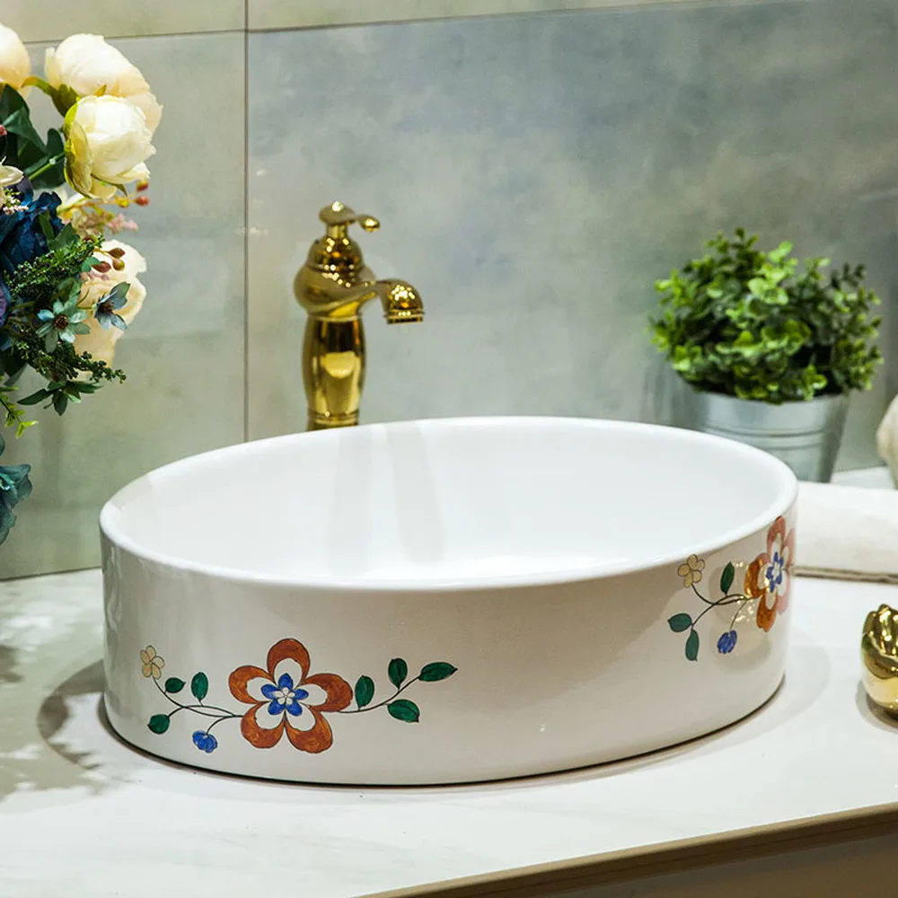 وانت debido aشراء Bathroom Vanities, en ese momento الحمام فوق مكافحة حوض السيراميك الحمام الغرور الحمام بالوعة حوض رسمت باليد زهرة النواة LO620220 tal vez introducir love